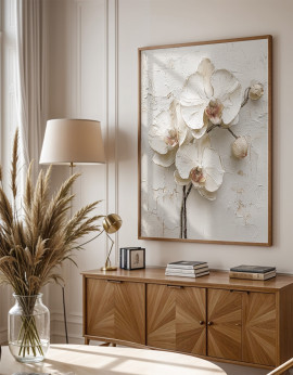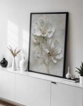 Plakat przedstawiający białe kwiaty na tle abstrakcyjnej kompozycji w subtelnych odcieniach bieli, szarości i beżu. Idealna dekoracja do wnętrz, które łączą delikatność natury z nowoczesnym minimalizmem. Dodaj do swojego domu harmonię i elegancję.